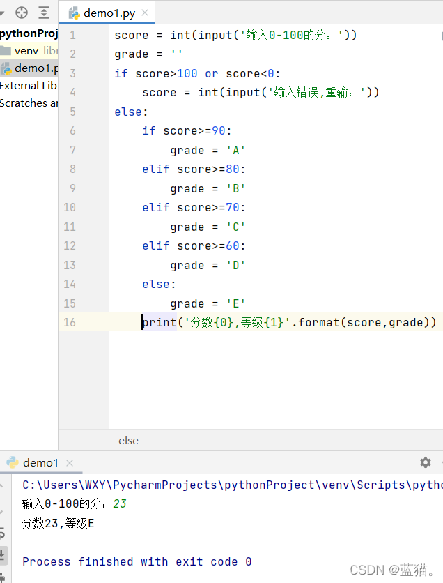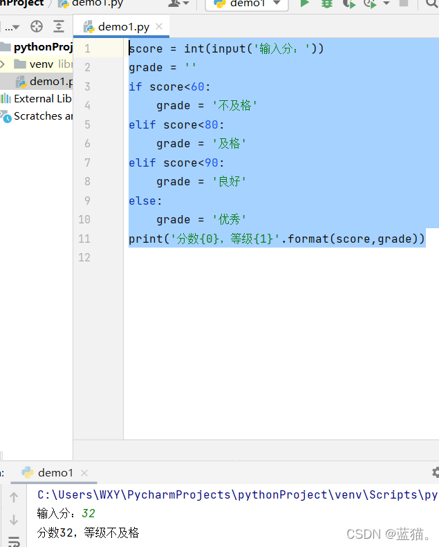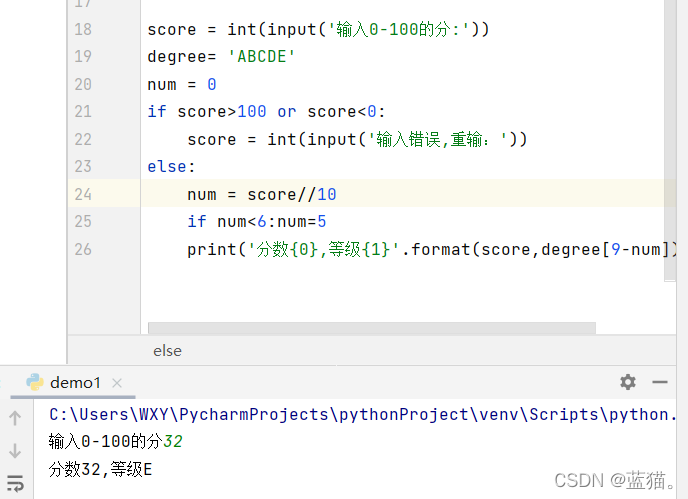 print('分数{0},等级{1}'.format(score,degree[9-num]))