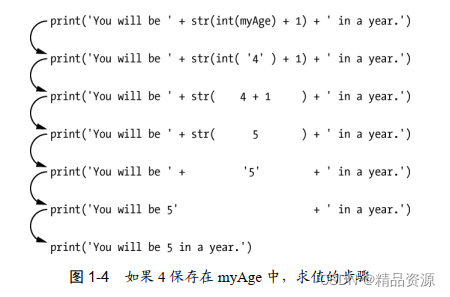 1.6.6 ?str()、int()和 float()函数 如果想要连接一个整数(如 29)和一个字符串,再传递给 print(),就需要获得值'29'。它是 29 ?的字符串形式。str()函数可以传入一个整型值,并求值为它的字符串形式,像下面这样: >>> ?str(29) '29' >>> ?print('I ?am ?' ?+ ?str(29) ?+ ?' ?years ?old.') I ?am ?29 ?years ?old. 因为 str(29)求值为’29’,所以表达式'I am ' + str(29) + ' years old.'求值为'I am ' + '29' + ' years old.',它又求值为'I? am 29 years old.'。这就是传递给 print()函数的值。 str()、int()和 float()函数将分别求值为传入值的字符串、整数和浮点数形式。请尝试用这些函数在交互式环境中转换一些值,看看会发生什么。 >>> ?str(0) '0' >>> ?str(-3.14) '-3.14' >>> ?int('42') 42 >>> ?int('-99') -99 >>> ?int(1.25) 1 >>> ?int(1.99) 1 >>> ?float('3.14') 3.14 >>> ?float(10) 10.0