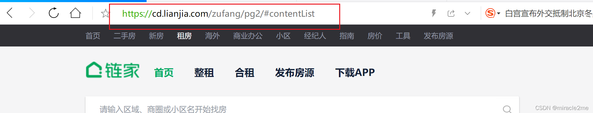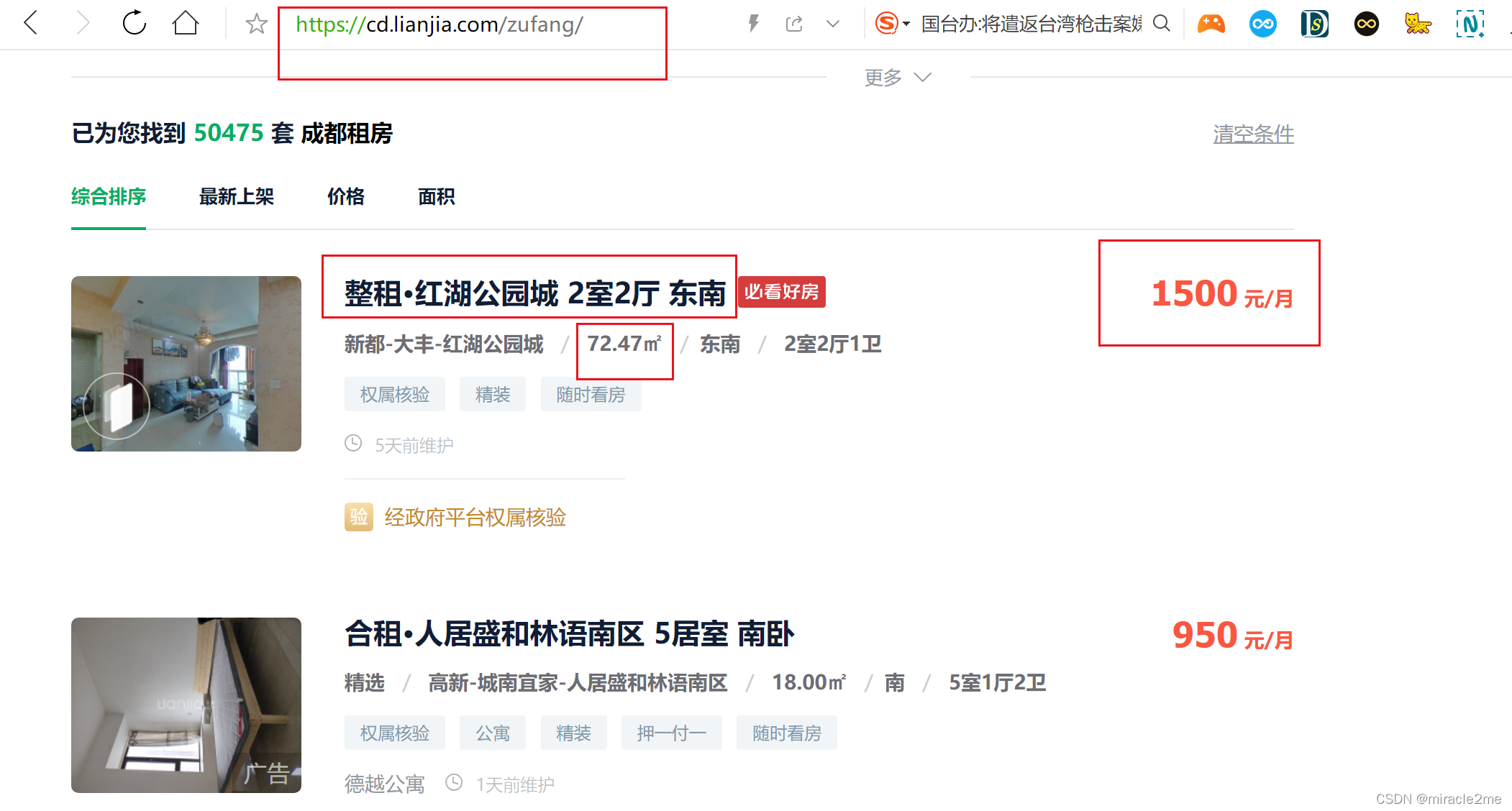 这次爬取目标是租房市场信息,地区选择成都,筛选具体字段包括‘小区名称’,‘价格’,‘面积’。