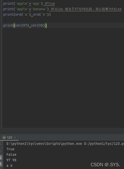 比较原理:两个字符进行比较时,比较的是其ordinal value(原始值),调用内置函数ord可以得到指定字符的ordinal value。与内置函数ord对应的是内置函数chr,调用内置函数chr时,指定ordinal value可以得到其对应的字符