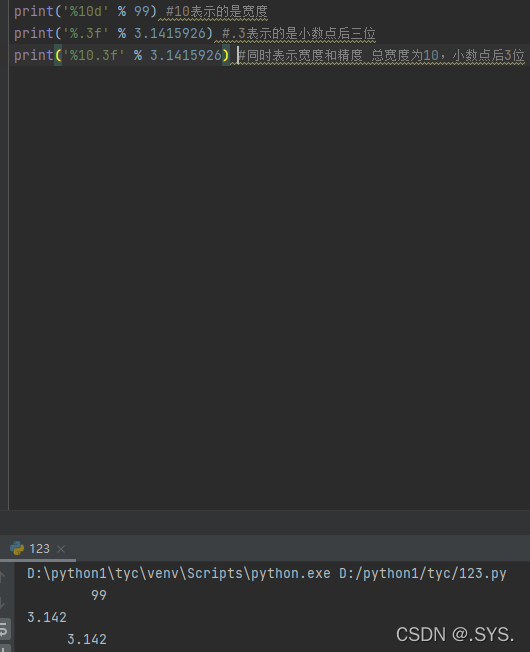 print('%10.3f' % 3.1415926) #同时表示宽度和精度 总宽度为10,小数点后3位
