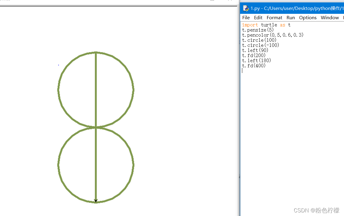 import turtle as t t.pensize(5)? ? ? ? ? ? ? ? ? ? ? ? ? ? ? ? ? ? ? ? ? ? ? ? ? ? ? ? ? ? ? ? ? ? ? ? ? ? ? ?#画笔大小 t.pencolor(0.5,0.6,0.3)? ? ? ? ? ? ? ? ? ? ? ? ? ? ? ? ? ? ? ? ? ? ? ? ? ? ? ? ? ? ? ?#画笔颜色 t.circle(100)? ? ? ? ? ? ? ? ? ? ? ? ? ? ? ? ? ? ? ? ? ? ? ? ? ? ? ? ? ? ? ? ? ? ? ? ? ? ? ? #圆的大小 t.circle(-100) t.left(90)? ? ? ? ? ? ? ? ? ? ? ? ? ? ? ? ? ? ? ? ? ? ? ? ? ? ? ? ? ? ? ? ? ? ? ? ? ? ? ? ? ? ??#画笔方向 t.fd(200)? ? ? ? ? ? ? ? ? ? ? ? ? ? ? ? ? ? ? ? ? ? ? ? ? ? ? ? ? ? ? ? ? ? ? ? ? ? ? ? ? ? ? ?#画笔方向向前 t.left(180) t.fd(400)