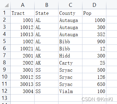 # 数据结构用字典类型存数据(AL-state州;Autauga-county县;tract-地区的和;pop-人数的和)