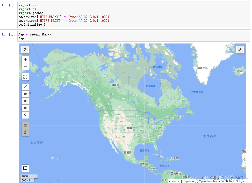 import ee import os import geemap os.environ['HTTP_PROXY'] = 'http://127.0.0.1:10001'(替换成自己的代理服务器端口,我的是10001) os.environ['HTTPS_PROXY'] ='http://127.0.0.1:10001' ee.Initialize()