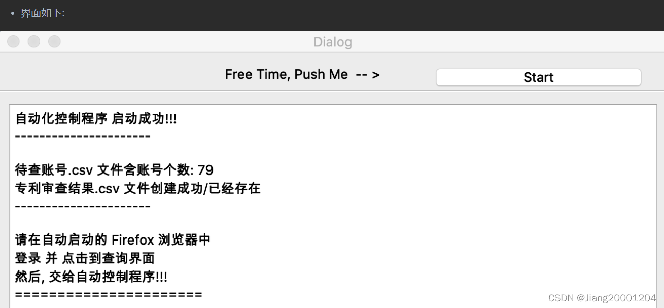 self.creatfile() ? ? ? ? ? ? self.show_in_textBrowser.emit('专利审查结果.csv 文件创建成功/已经存在') ? ? ? ? ? ? self.show_in_textBrowser.emit('----------------------\n') ? ? ? ? ? ? self.show_in_textBrowser.emit( ? ? ? ? ? ? ? ? '请在自动启动的 Firefox 浏览器中\n登录 并 点击到查询界面\n然后, 交给自动控制程序!!!') ? ? ? ? ? ? self.show_in_textBrowser.emit('======================\n')