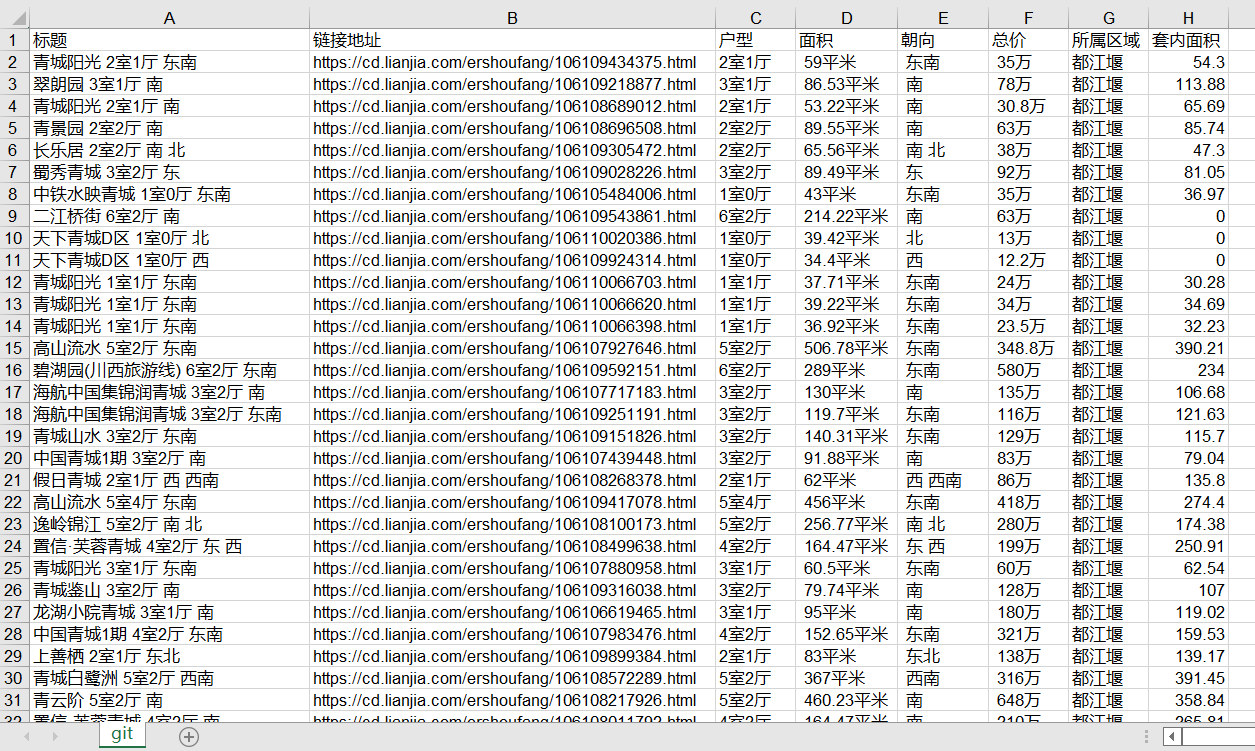 row0 = ['标题', '链接地址', '户型', '面积', '朝向', '总价', '所属区域', '套内面积']