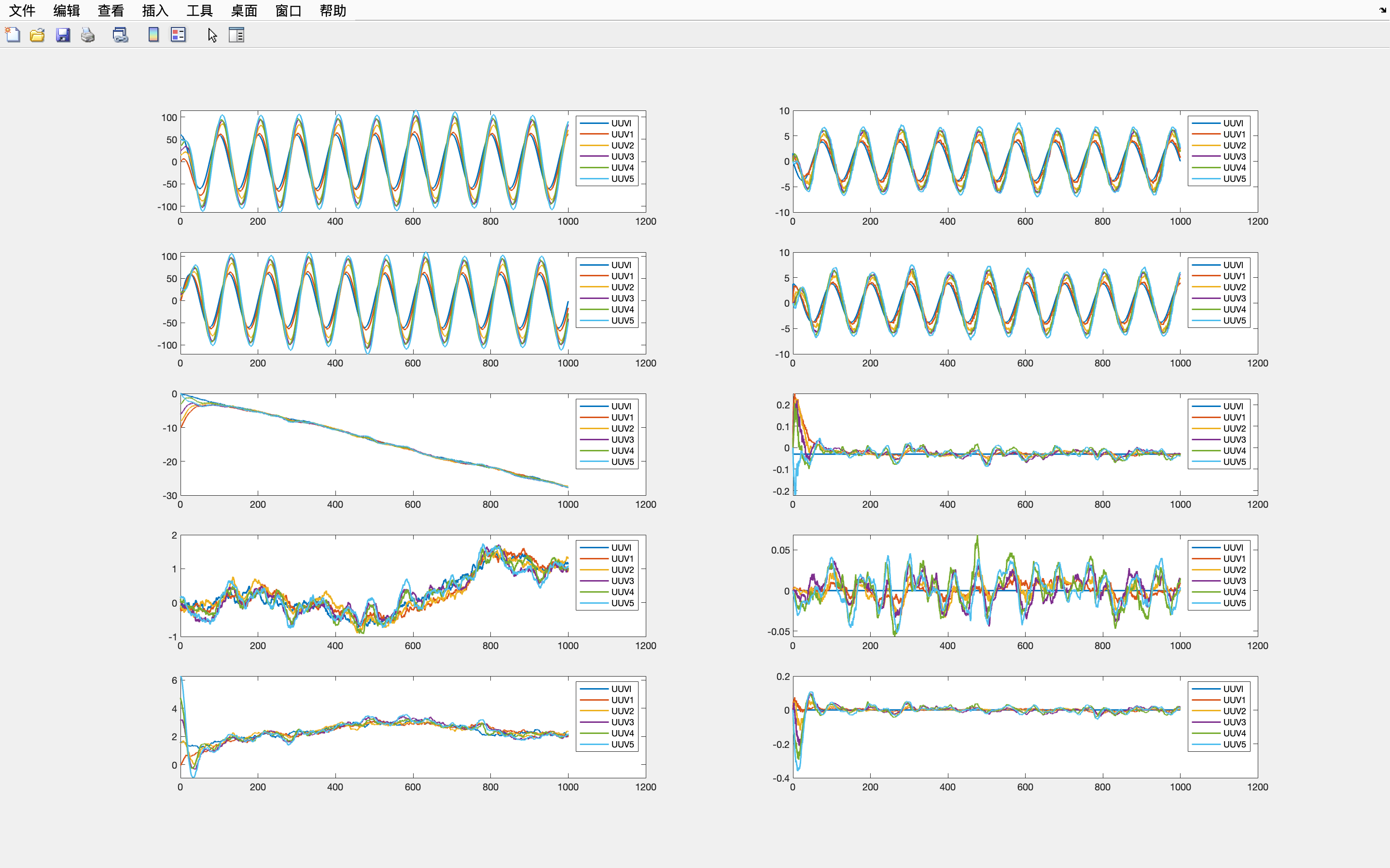 t 时刻的协调控制输入为 4.4.2 海洋噪声环境下的潜航器编队协调控制在上文分析结果的基础上,首先假设潜航器编队在水下机动时会产生附加非线性因素,其次,将海流等外部扰动概括为未知外部扰动。 取外部海流扰动 ω i ( t ) \omega_i(t) ωi?(t) 为有界连续函数。在此约束条件下,反馈线性化后的跟随者潜航器模型可以表示为 x ˙ i ( t ) = v i ( t ) + ω i ( t ) v ˙ i ( t ) = u i ( t ) + f v ( x i ( t ) , v i ( t ) ) (4-105) \begin{aligned} \dot{x}_i(t) =& v_i(t) \red{+ \omega_i(t)} \\ \dot{v}_i(t) =& u_i(t) \red{+ f_v(x_i(t), v_i(t))} \\ \end{aligned} \tag{4-105} x˙i?(t)=v˙i?(t)=?vi?(t)+ωi?(t)ui?(t)+fv?(xi?(t),vi?(t))?(4-105) 领航者潜航器的模型为 x ˙ l ( t ) = v l ( t ) + ω l ( t ) v ˙ l ( t ) = f v ( x l ( t ) , v l ( t ) ) (4-106) \begin{aligned} \dot{x}_l(t) =& v_l(t) \red{+ \omega_l(t)} \\ \dot{v}_l(t) =& \red{f_v(x_l(t), v_l(t))} \\ \end{aligned} \tag{4-106} x˙l?(t)=v˙l?(t)=?vl?(t)+ωl?(t)fv?(xl?(t),vl?(t))?(4-106) 其中, ω i ( t ) , ω l ( t ) \omega_i(t), \omega_l(t) ωi?(t),ωl?(t) 表示外部海流扰动, f v ( x i ( t ) , v i ( t ) ) f_v(x_i(t), v_i(t)) fv?(xi?(t),vi?(t)) 表示系统的附加非线性因素。 4.5 仿真验证4.5.1 不稳定通信条件下无领航者潜航器编队协调控制