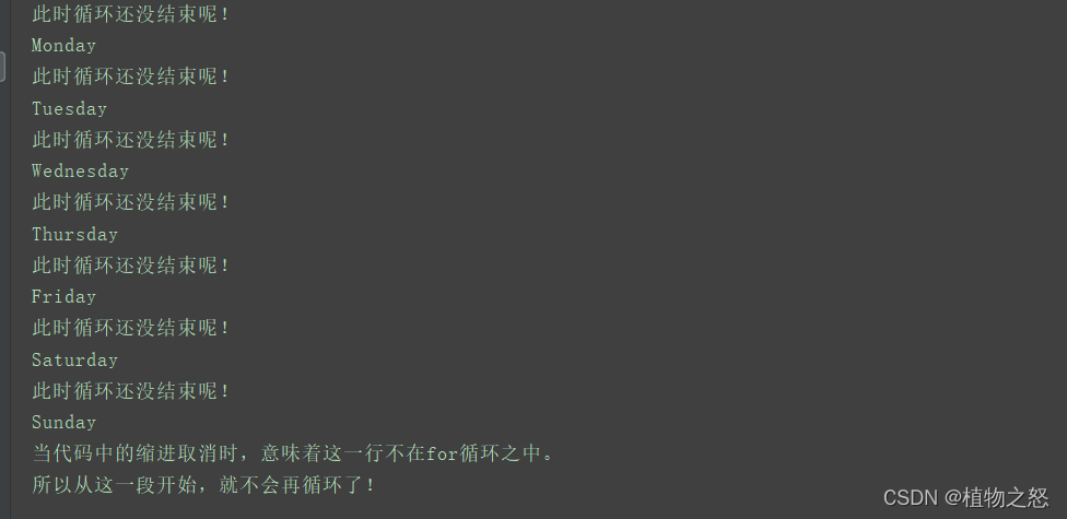 ? ? ? ? 用人话总结就是——for循环,首先for顶格,然后需要循环的内容都要缩进。在for缩进之内的都归for管。不想循环的内容(想跳出循环),就要把缩进还原。