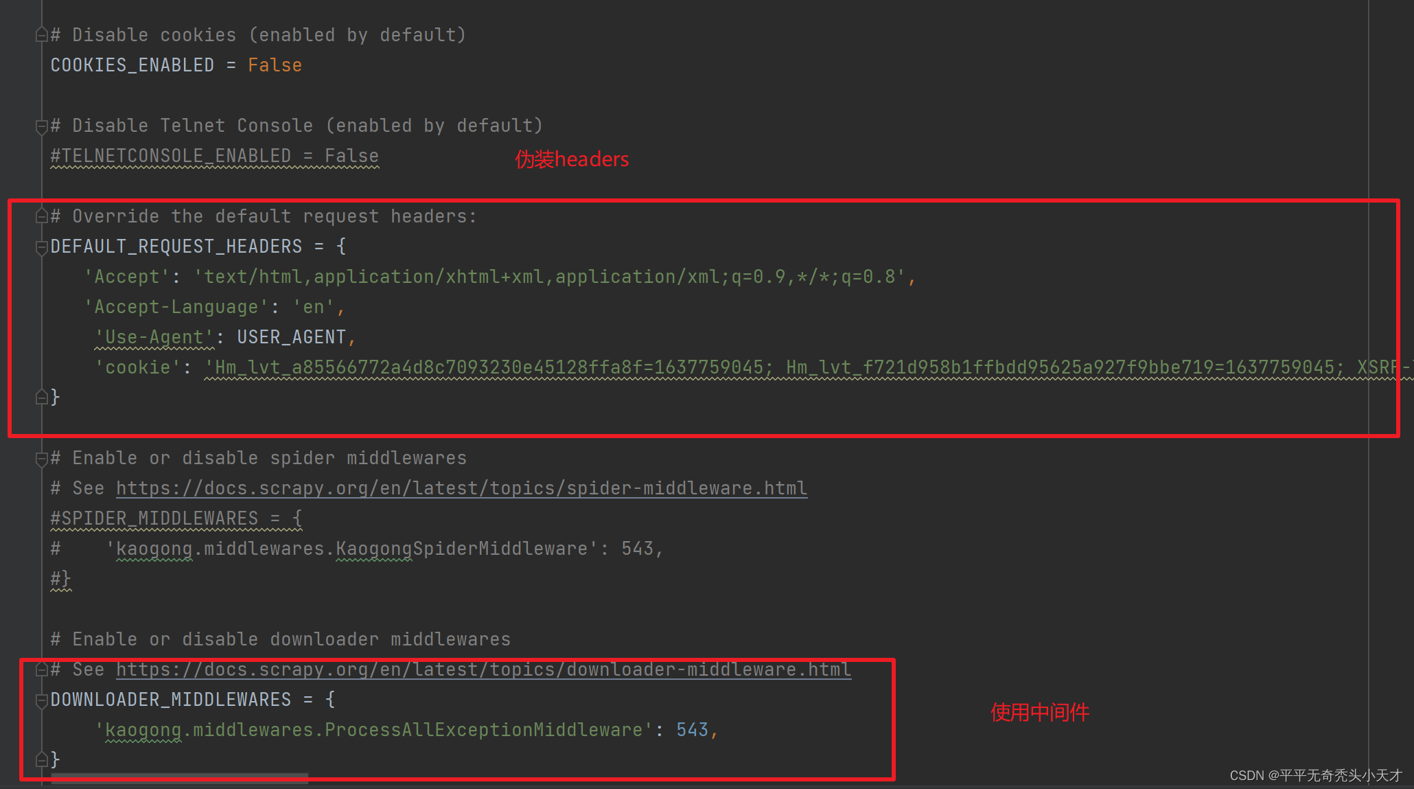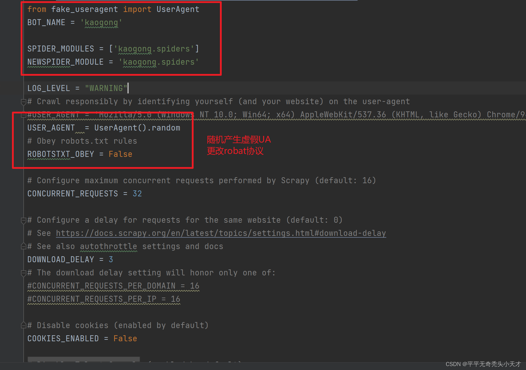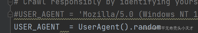 在settings文件中设置一个虚假的Use-Agent,在python中的UserAgent库中有一个fake_useragent模块可以生成虚假use-Agent,再用random函数随机生成虚假use-Agent。