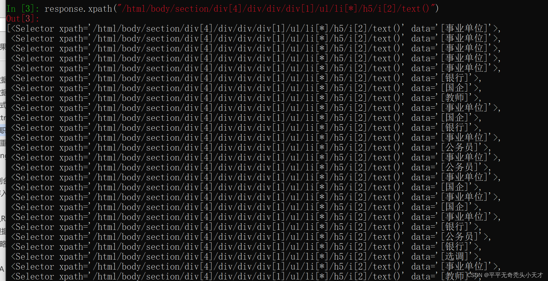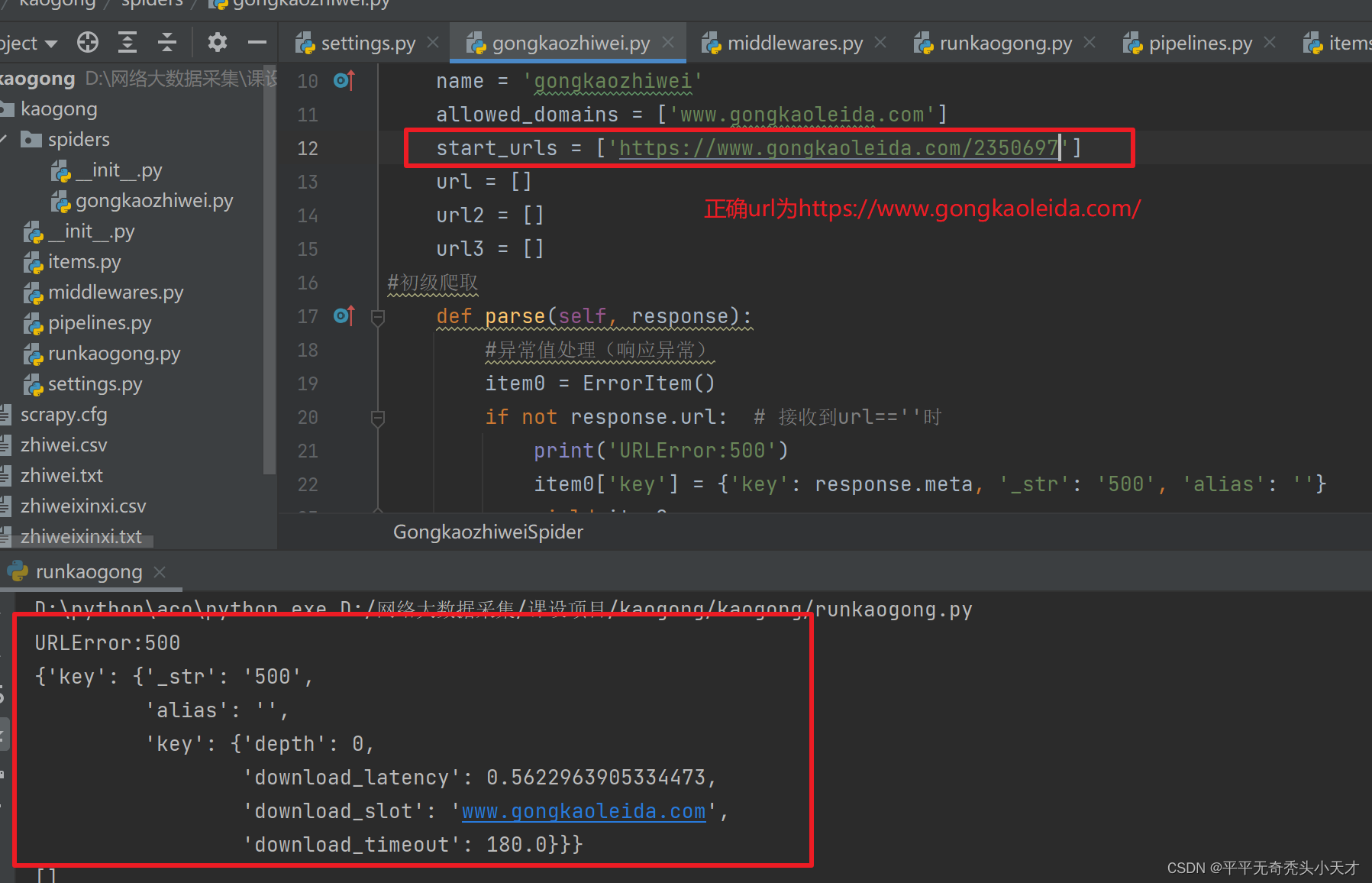 class GongkaozhiweiSpider(scrapy.Spider): ??? name = 'gongkaozhiwei' ??? allowed_domains = ['www.gongkaoleida.com'] ??? start_urls = ['https://www.gongkaoleida.com/'] ??? url = [] ??? url2 = [] ??? url3 = [] #初级爬取 ??? def parse(self, response): ??????? #异常值处理(响应异常) ??????? item0 = ErrorItem() ??????? if not response.url:? # 接收到url==''时 ??????????? print('URLError:500') ??????????? item0['key'] = {'key': response.meta, '_str': '500', 'alias': ''} ??????????? yield item0 ??????? elif 'exception' in response.url: ??????????? print('Sorry exception') ??????????? item0['key'] = {'key':response.meta,'_str':'EXCEPTION','alias':''} ??????????? yield item0 ??????? else: ??????????? print('Request successfully') ??????? #利用scrapy链接提取器 ??????? #提取内链url ??????? link = LinkExtractor(restrict_xpaths='/html/body/section/div[1]/div[*]/ul/li[*]/span[1]/a') ??????? links = link.extract_links(response) ??????? print(links)#输出提取到的 ??????? #循环检索内链 ??????? for link in links: ???????? ???#输出内链的url以及内链信息 ??????????? print(link.url, link.text) ??????????? #将内链追加为列表 ??????????? self.url.append(link.url) ?? ?????????#定义item ??? ????????#将数据内容装入item ??????????? item = KaogongItem() ??????????? item['url'] = link.url ??????????? item['url_text'] = link.text ??????????? #传入item ??????????? yield item ??????????? #传入下一级爬取 ??????????? yield scrapy.Request(url=item['url'],callback=self.del_parse)