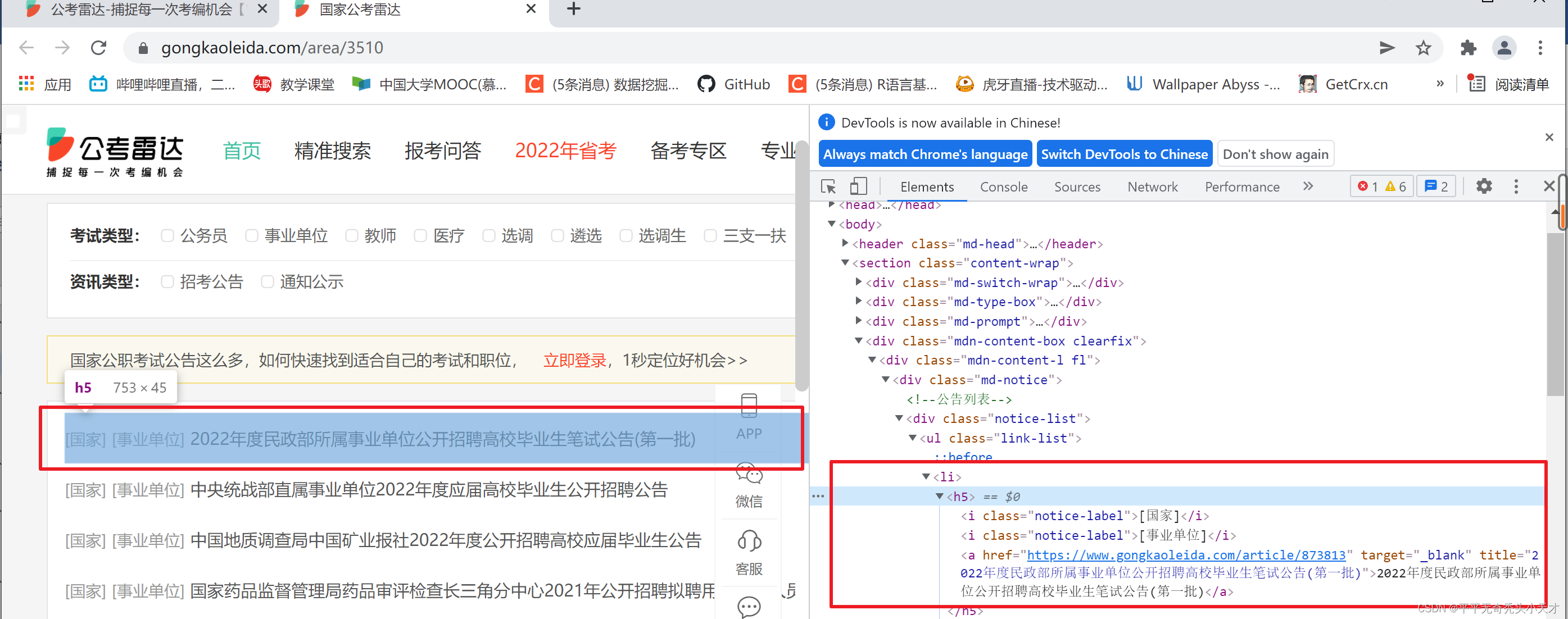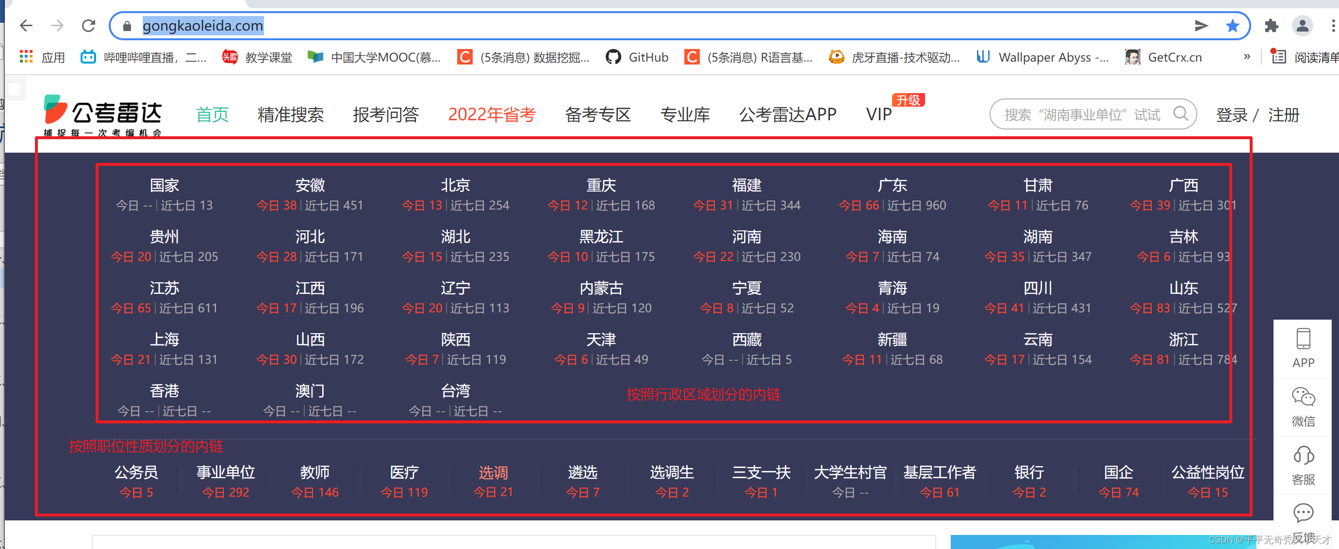 此次项目爬取的网站为公考雷达网站(https://www.gongkaoleida.com/),网站主要作用为汇总全国的事业编、公务员等职位信息。