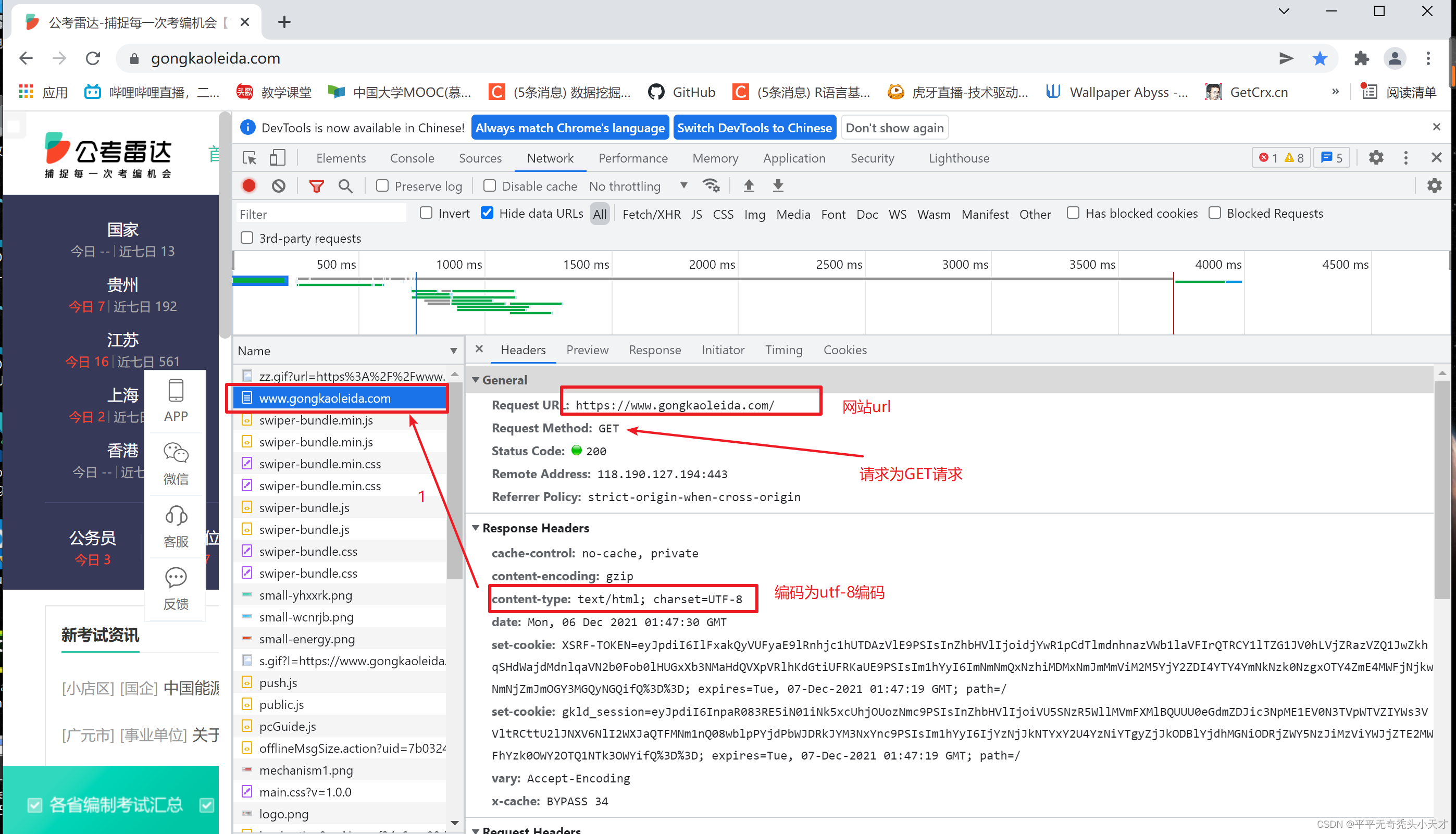 观察网页特点一般使用浏览器开发者工具,观察网页获取请求的方式以及网页是静态或动态,存放数据的具体位置等等。通过浏览器开发者工具观察网页特点如下图,网页为静态网页,请求方式为GET请求,编码为utf-8编码,网站为静态网站,要提取的数据在html中都有显示。