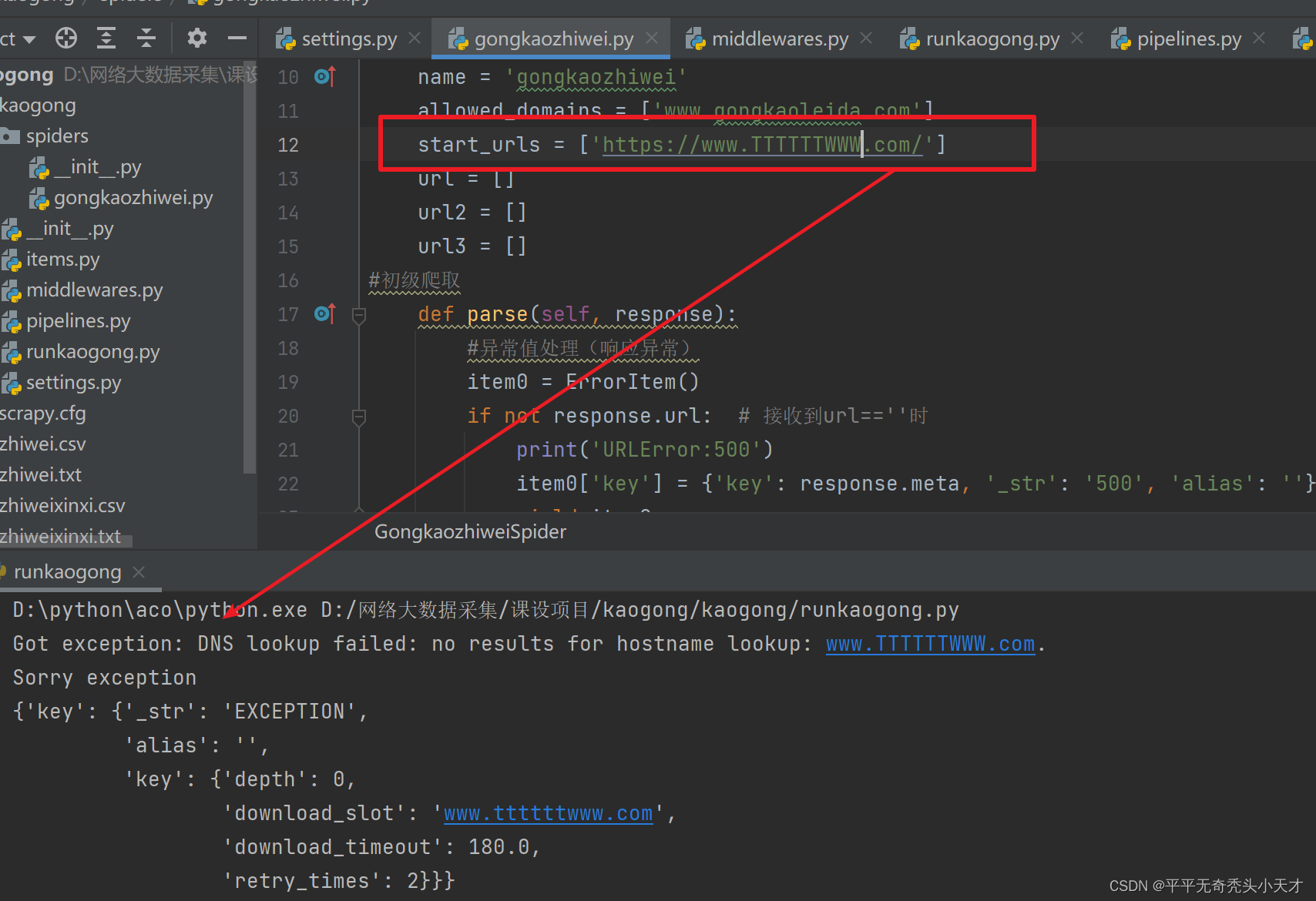 ???参考《如何在scrapy中捕获并处理各种异常》一文,制定一个中间件异常处理模块模拟日志中RetryMiddleware工作方式,将url更改为错误url,测试中间件是否能捕获异常。