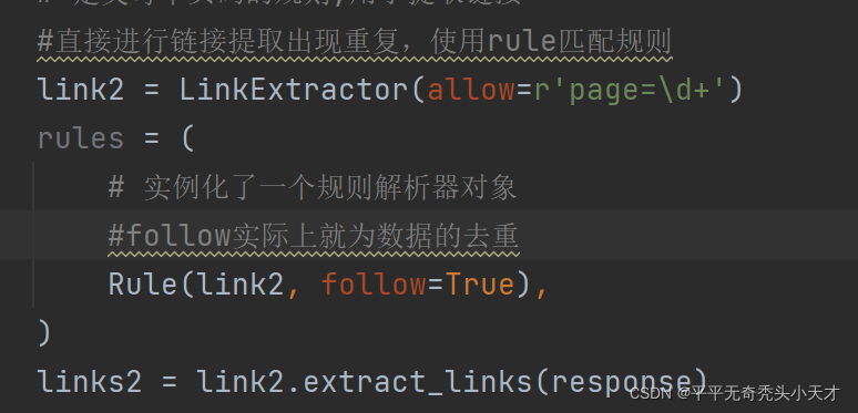 在爬取最终提取信息的内链链接时,采用的是提取最下方的页面链接传递给下级进行爬取,在最下方的页面链接跳转出使用链接提取器获取会出现链接重复的问题,‘下一页’提取出的链接会与第二页重复,‘尾页提取出来的链接会与最后一页的链接重复,方便快捷的同时应该做到避免重复,所以应用Crawling rules实现url去重,从而避免数据的重复爬取。