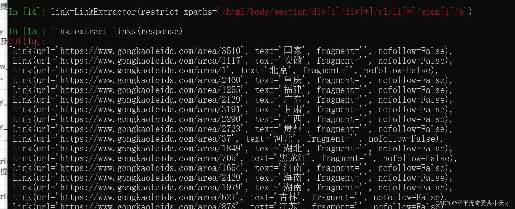 scrapy.linkextractors模块中提供了与Scrapy捆绑在一起的链接提取器类,通过链接提取器提取出来url可以直接存入item传入下级爬取,在本项目中使用了restrict_xpaths,restrict_xpaths是一个XPath(或XPath的列表),它定义响应中应从中提取链接的区域。如果给出,只有那些XPath选择的文本将被扫描链接。