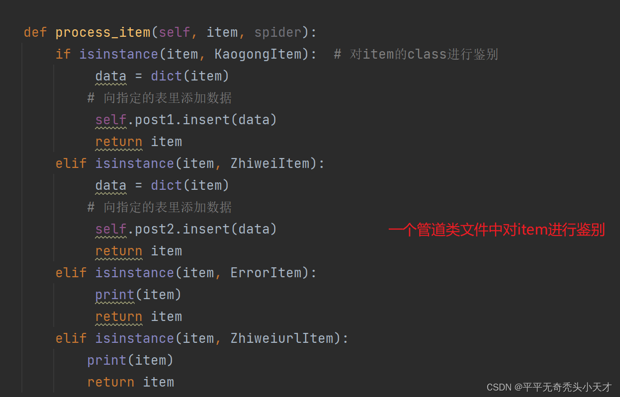 ??? def process_item(self, item, spider): ??????? if isinstance(item, KaogongItem):? # 对item的class进行鉴别 ??????? ?????data = dict(item) ??????????? # 向指定的表里添加数据 ???????????? self.post1.insert(data) ???????????? return item ??????? elif isinstance(item, ZhiweiItem): ???????????? data = dict(item) ??????????? # 向指定的表里添加数据 ???????????? self.post2.insert(data) ????????? ???return item ??????? elif isinstance(item, ErrorItem): ???????????? print(item) ???????????? return item ??????? elif isinstance(item, ZhiweiurlItem): ??????????? print(item) ??????????? return item
