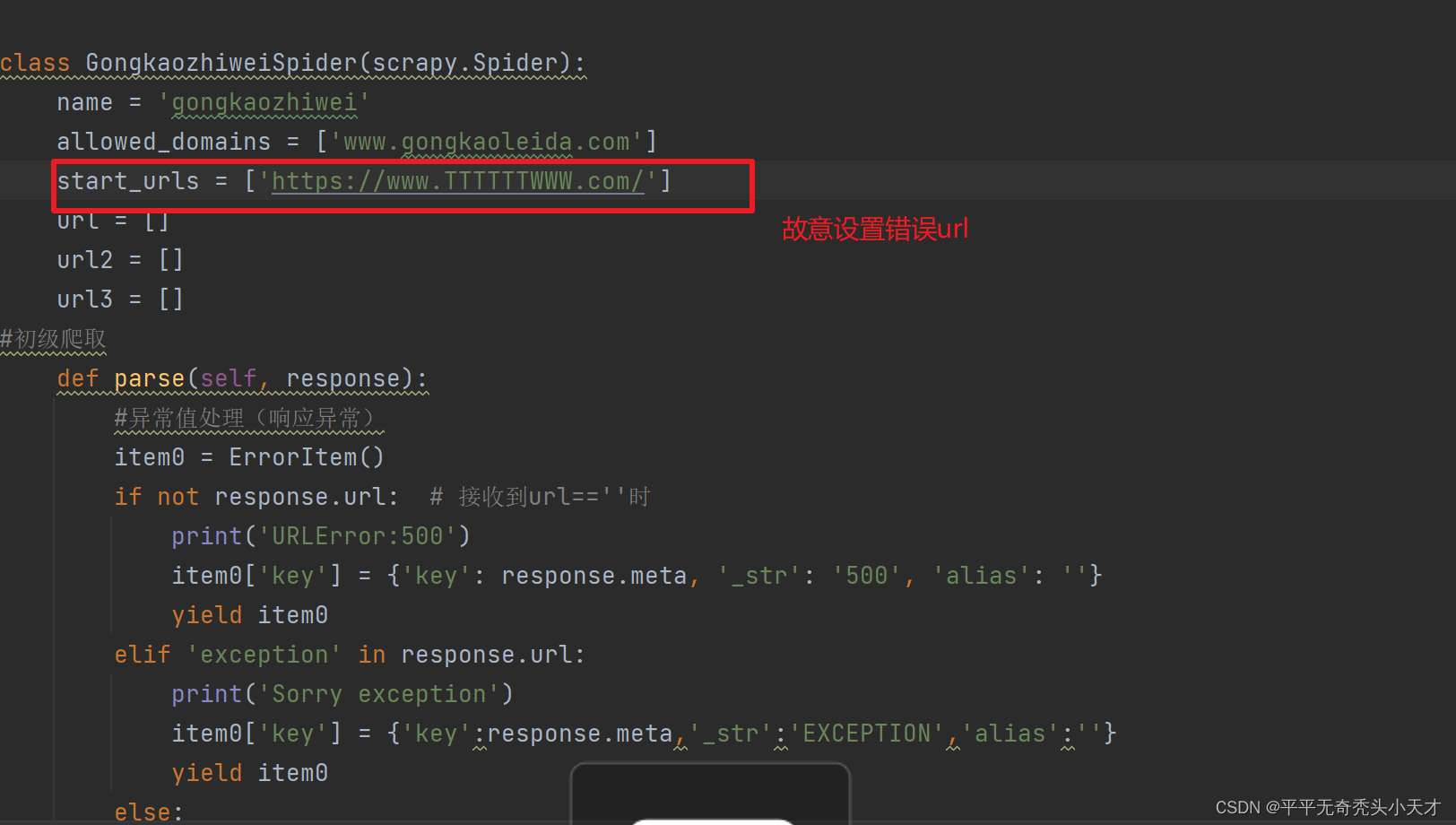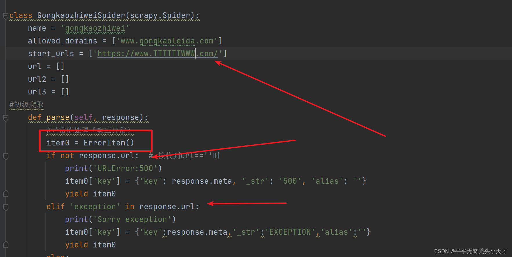 ??? def del_parse(self, response): ??????? #异常值处理 ??????? item0 = ErrorItem() ??????? if not response.url:? # 接收到url==''时 ??????????? print('URLError:500') ??????????? item0['key'] = {'key': response.meta, '_str': '500', 'alias': ''} ??????? ????yield item0