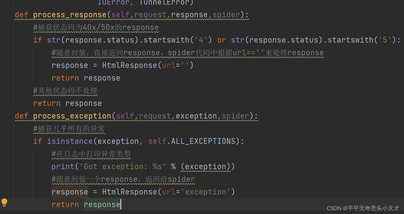 class ProcessAllExceptionMiddleware(object): ??? ALL_EXCEPTIONS = (defer.TimeoutError, TimeoutError, DNSLookupError, ????????????????????? ConnectionRefusedError, ConnectionDone, ConnectError, ????????????? ????????ConnectionLost, TCPTimedOutError, ResponseFailed, ????????????????????? IOError, TunnelError) ?? ?def process_response(self,request,response,spider): ??????? #捕获状态码为40x/50x的response ??????? if str(response.status).startswith('4') or str(response.status).startswith('5'): ??????????? #随意封装,直接返回response,spider代码中根据url==''来处理response ??????????? response = HtmlResponse(url='') ?????? ?????return response ??????? #其他状态码不处理 ??????? return response ??? def process_exception(self,request,exception,spider): ??????? #捕获几乎所有的异常 ??????? if isinstance(exception, self.ALL_EXCEPTIONS): ??????????? #在日志中打印异常类型 ??????????? print('Got exception: %s' % (exception)) ??????????? #随意封装一个response,返回给spider ??????????? response = HtmlResponse(url='exception') ??????????? return response