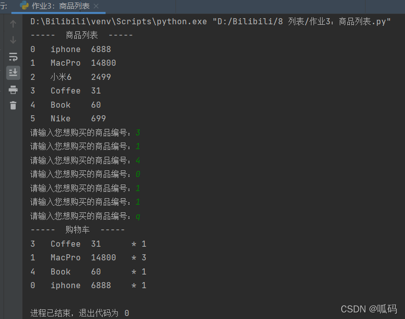 print(Trolley[i][2], " ", end="\t") # 格式化输出购物车列表,由于商品编码为1的商品价格超过4位数少于8位数,故在价格后加空格