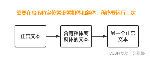 - Character-level formatting, such as bold and italic, are applied at the?run?level(运行级别). All content within a paragraph must be within a run, but there can be more than one. So a paragraph with a bold word in the middle would need three runs, a normal one, a bold one containing the word, and another normal one for the text after.