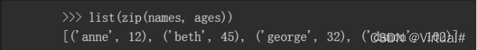 tip:当序列的长度不同时,函数zip将在最短的序列用完后停止“缝合”。