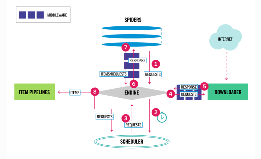 - step5,页面完成下载后(从Internet下载),Downloader 会生成一个响应(并且携带该页面),通过 Downloader Middlewares将其发送到Engine;
