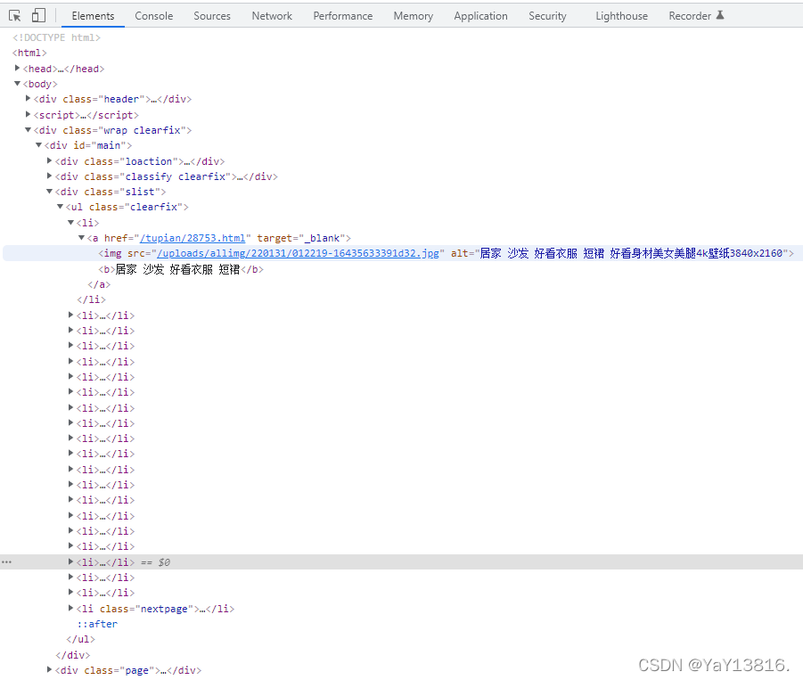 div→ul 下全是li标签,每张图片都是在li标签里面,然后li标签下有a标签,而a标签下的img就有我们需要获取的src的属性值(图片链接)和alt属性值(图片名字)。接下来我们看看代码: