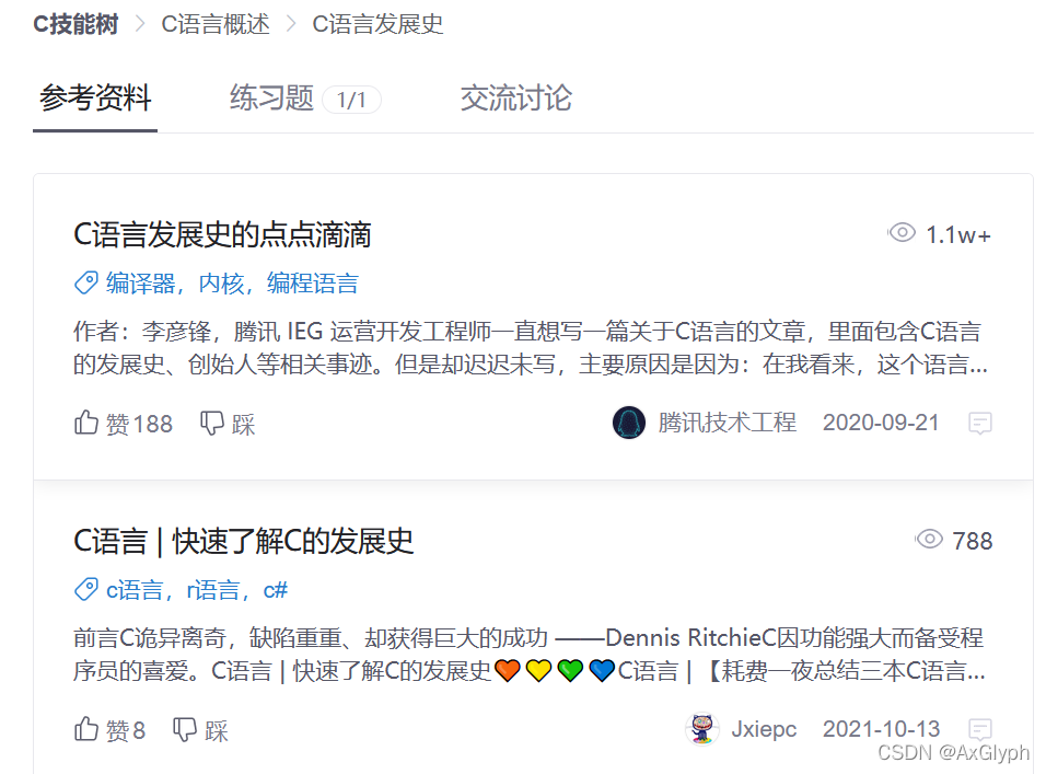 以C技能树>C语言概述>C语言发展史为例。进入学习,大家可以看见目前的参考资料有五条。点进去后也是可以下拉出很长的内容。