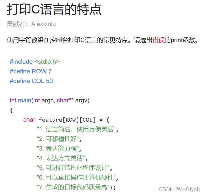 当我在练习C技能树>C语言概述>C语言特点时,我不由得升起一丝疑惑,这练习题和C语言特点有啥关系。题目的标题很有趣,打印C语言的特点,而联系题确实在考"printf"的语法知识,不觉得是“人类迷惑行为”么。这给我的感觉不像是在吸引学生,而是在劝退一些“菜鸟”。