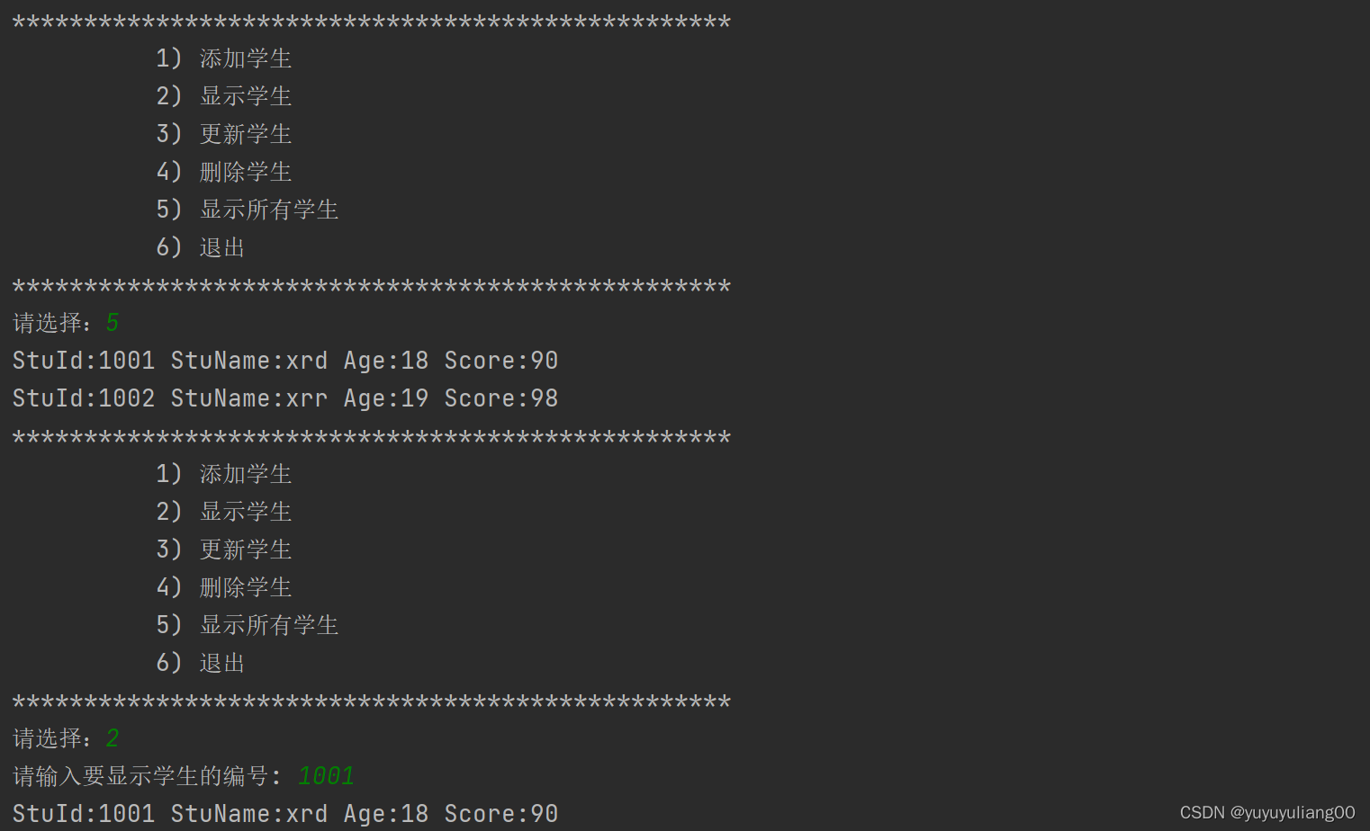 chooses = ["添加学生", "显示学生", "更新学生", "删除学生", "显示所有学生", "退出"]