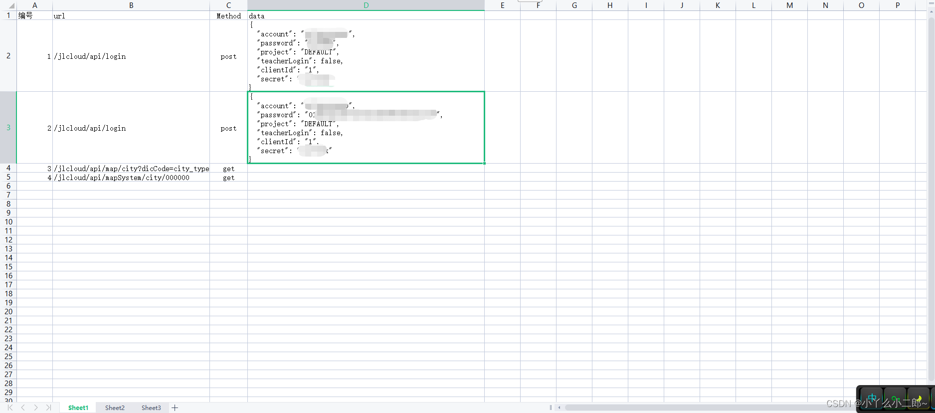 今天想试试把所有用例写入excel通过读取excel中的数据进行接口自动化,写了一点发现目前的脚本局限性还是很大,比如测试接口的token要传入后续接口,这就使得我在循环的时候,必须将正确的登录参数写在最后,否则无法获得最新的token,还有其它这个目前很难参数化,先记录下来,后续如果有更好的再来更新