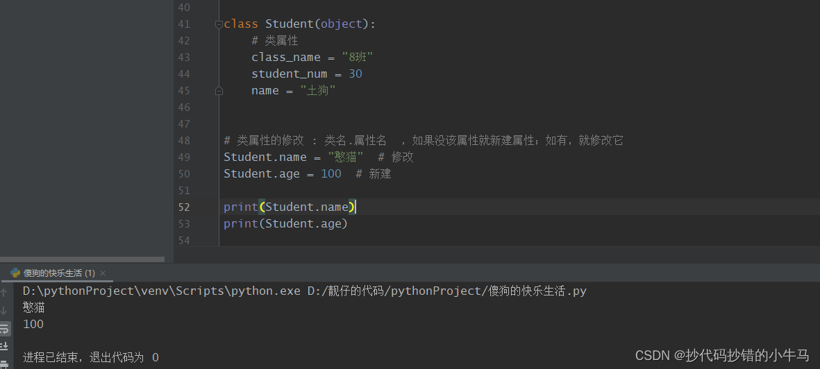 # 类属性的修改 : 类名.属性名 ,如果没该属性就新建属性;如有,就修改它