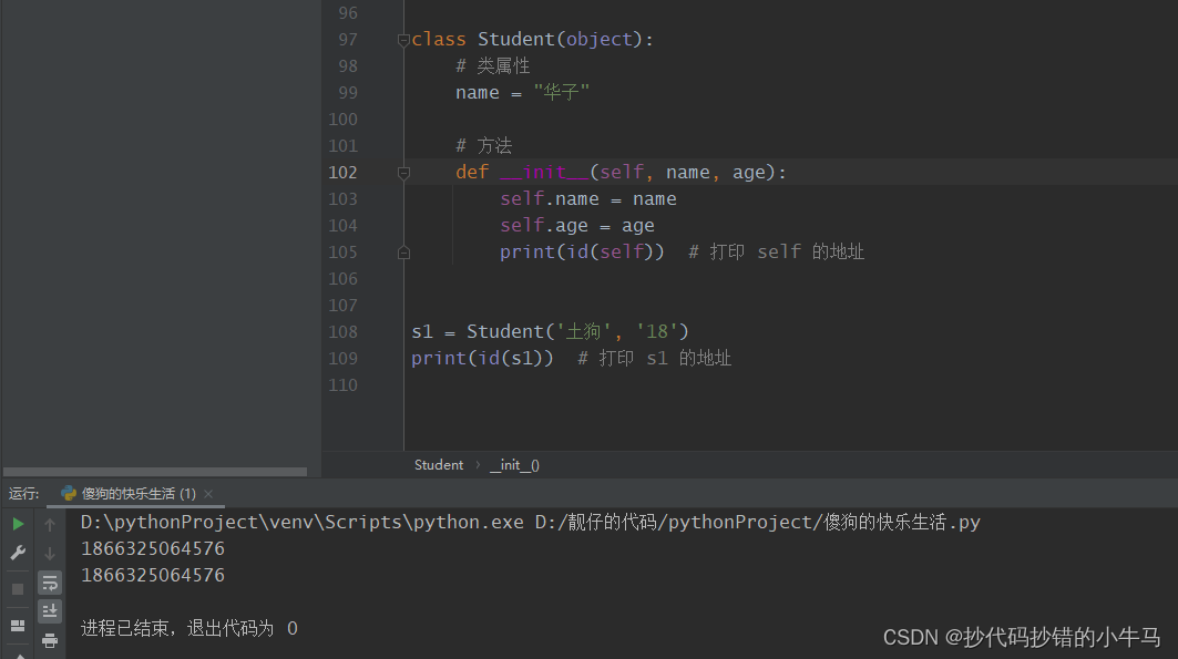 ?这里注意的是,Student()实例化后才会赋值给 s1 等变量,而Student()实例化的时候它会自动的触发__init__方法,而我们又可以认为self就是s1,因为下图:
