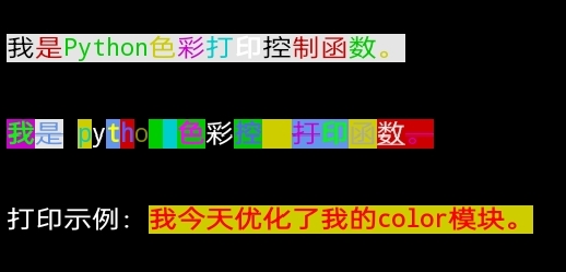 {color('我今天优化了我的color模块。', 'light', 'b_yellow', 'f_red')}")