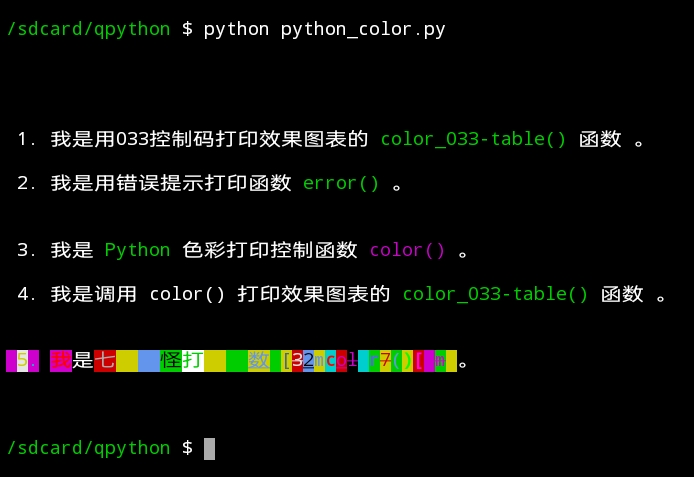 ??我的模块 python.color 内含五个函数。error() 是内部调用函数,带 “table” 的是色彩控制打印效果图表。真正有用的就一个 color() ,color7()是搞怪用的。