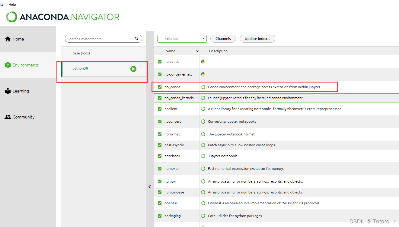 ?这时可以再anaconda中看到新建的python3.8,点击python38,重新安装nb_conda,显示成功。