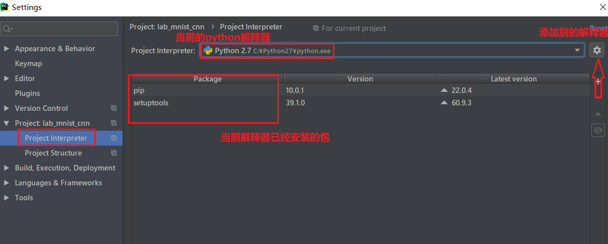 找到左侧的project interpreter,看到右边是当前使用的python解释器,点后面的螺丝一样的按钮add别的解释器: