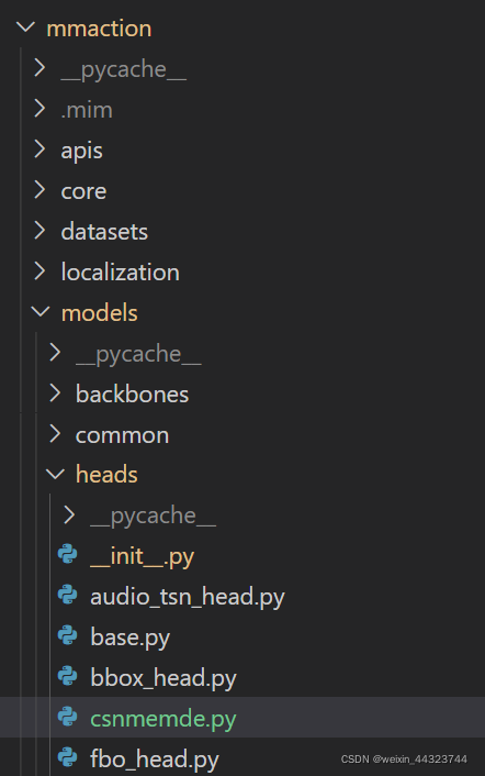 在 mmacyion2/mmaction/models/head 的目录下添加csnmemde.py,或者可以直接在改目录下编辑代码。