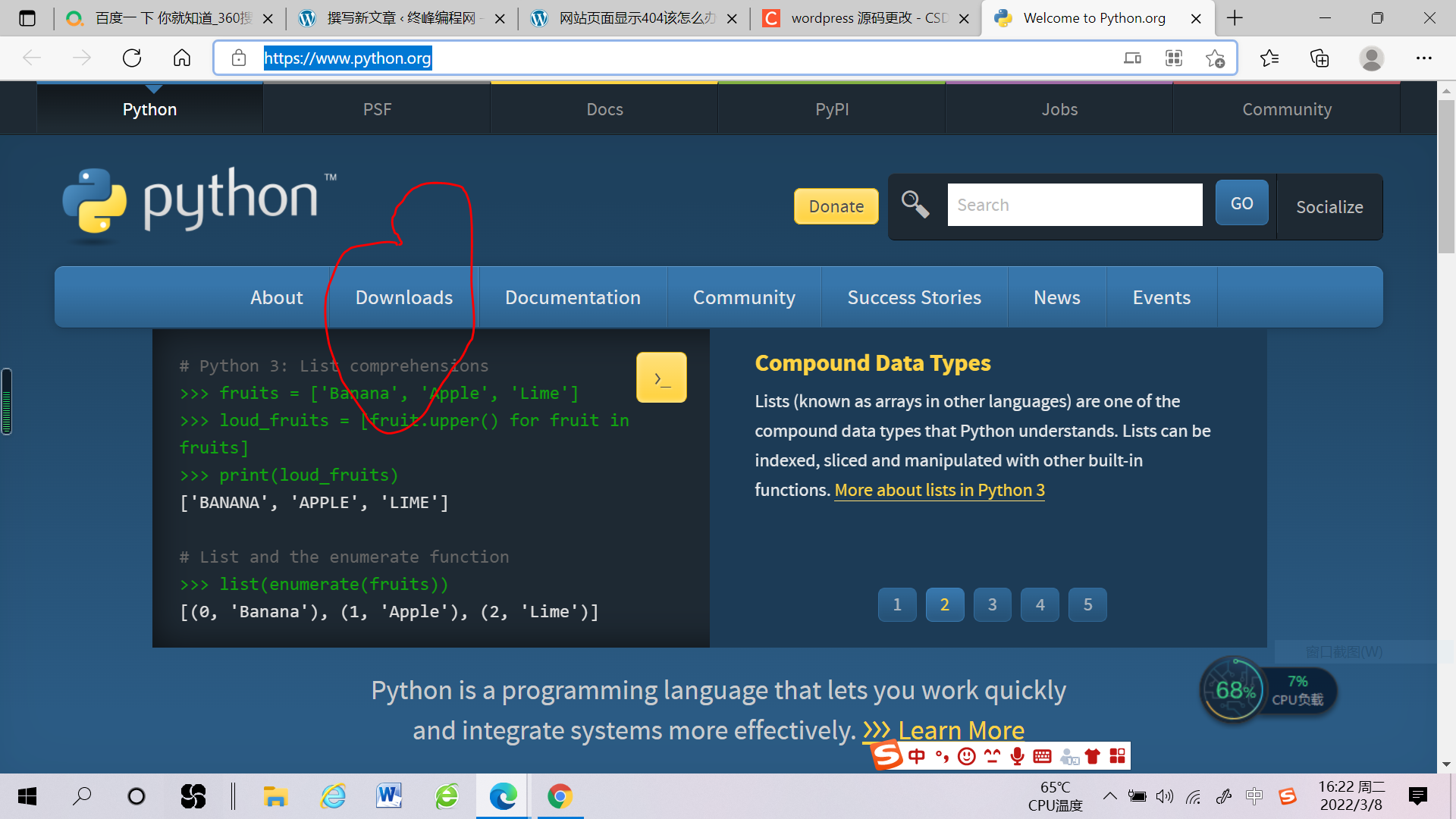 考虑到读者受众问题,我会尽量以史诗级小白的方式去说明如何安装Python python 1 来到Python官网:Welcome to Python.org,选择downloads