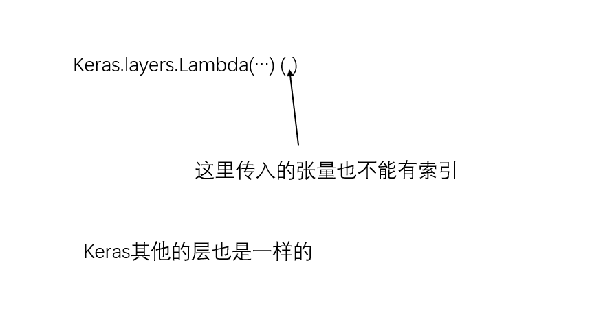emmm! 原来在搭建网络时,括号里传入的张量也不能用索引,必须放到Lambda处理,改成以下代码: