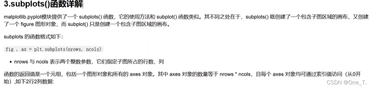 - subplots() : 既创建了一个包含子图区域的画布,又创建了一个 figure 图形对象,(返回图形对象和区域对象)