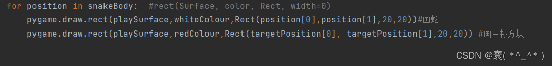 pygame.draw.rect(playSurface,whiteColour,Rect(position[0],position[1],20,20))#画蛇