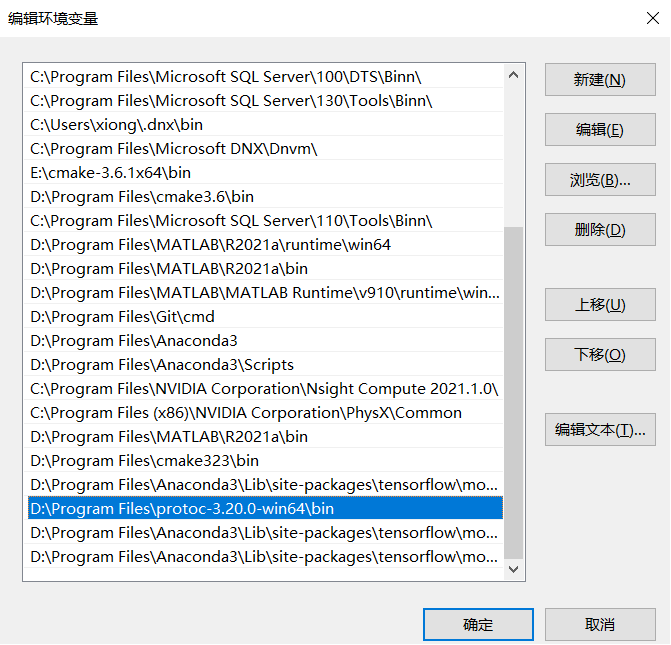 1新建虚拟环境 conda create -n tensorflow_delf python=3.8(新建) conda activate tensorflow_delf(激活) conda deactivate(关闭) 2 安装tensorflow 将下载好的tensorflow安装包tensorflow_gpu-2.6.0-cp38-cp38-win_amd64.whl拷贝至D:\Program Files\Anaconda3\envs\tensorflow_delf\Lib\site-packages 进入目录,安装tensorflow:pip install tensorflow_gpu-2.6.0-cp38-cp38-win_amd64.whl 3 安装protobuf pip install protobuf(安装tensorflow时已经自动安装) 下载protoc编译器(protoc-3.20.0-win64.zip,与protobuf版本对应) 解压后,将bin文件夹添加至环境变量