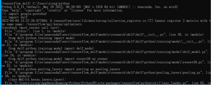 测试:打开cmd终端或Anaconda promot,输入protoc --version  安装成功。 4 安装python库依赖 pip install matplotlib pip install numpy pip install scikit-image pip install scipy 5 下载models,网址:https://github.com/tensorflow/models,将modal文件夹拷贝至D:\Program Files\Anaconda3\envs\tensorflow_delf中 (1)安装nets 进入 models/research/slim/ 文件夹, pip install -e .(注意:最后的.)  (2)通过编辑PYTHONPATH设置object_detection模块: 新建PYTHONPATH环境变量,添加 tensorflow/models/research/ 和 models/research/slim/文件夹的绝对路径  然后,编译delf的protobufs 进入 tensorflow/models/research/delf/ 文件夹 protoc delf/protos/.proto --python_out=.  正常情况是不输出东西,如果编译出错,可能是proto版本的问题,则安装新的版本。 最后,安装DELF包 进入 tensorflow/models/research/delf/ 文件夹 pip install -e . 测试:import delf   出现错误:tensorflow.python.framework.errors_impl.AlreadyExistsError:Another metric with the same name already exists. 解决方案:tensorflow和keras的版本有问题 pip install keras==2.6.0  安装成功 (3)安装object_detection库 首先安装其他依赖库 pip install --user Cython pip install --user contextlib2 pip install --user pillow pip install --user lxml pip install --user jupyter pip install --user matplotlib pip install tensorflow_io pip install pyyaml 然后编译Protobuf Tensorflow对象检测API使用Protobufs配置模型和训练参数。在使用框架之前,必须编译Protobuf库。这应该通过从tensorflow / models / research /目录运行以下命令来完成: 进入 tensorflow/models/research/ 文件夹 protoc object_detection/protos/.proto --python_out=. 最后,测试 python object_detection/builders/model_builder_test.py  6 Quick start:delf extaction and matching Dateset&Delf model (1)下载数据集 在tensorflow/models/research/delf/delf/python/examples/下新建data文件夹,进入data文件夹,再在data文件夹里新建oxford5k_images 和 oxford5k_features文件夹,把数据集解压到oxford5k_images里,以上是官方介绍。在examples下建一个文件夹test_images,选两张图片,重命名为image_1.jpg和image_2.jpg。 新建一个list_images.txt(models/research/delf/delf/python/examples/文件夹下新建)放两张图片的URL,添加URL 可以采用命令行方式: 进入models/research/delf/delf/python/examples/文件夹 echo test_images/image_1.jpg >> list_images.txt echo test_images/image_2.jpg >> list_images.txt 也可以直接在list_images.txt写两行: test_images/image_1.jpg test_images/image_2.jpg