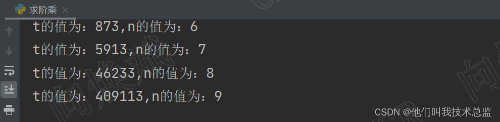 #求 t = 1! + 2! + …… + n!, 直到 t>10e5,并输出此时 t 和 n 的值