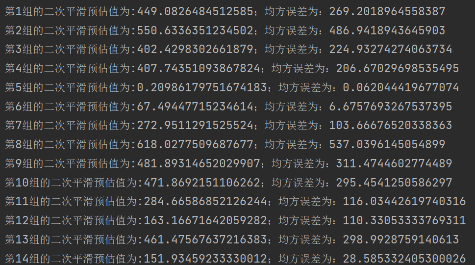 print('第' + str(i + 1) + '组的二次平滑预估值为:' + str(Xt[i]) + ';均方误差为:' + str(mse_array[alpha_fit][i]))