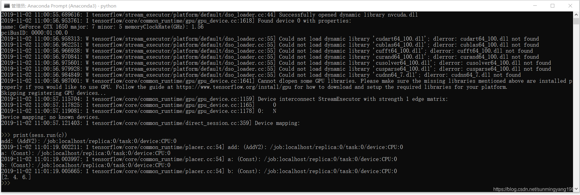 ?对于版本号大于1.13的tensorflow-gpu的1.x版本,如1.14、1.15,建议安装CUDA10.0,不要安装CUDA10.1,安装后会提示缺少很多库文件,而导致GPU版本的tensorflow无法使用,如下图所示: