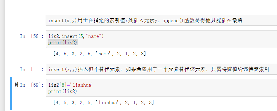?index()被用来找到一个特殊元素的索引值。但是如果有许多个元素具有相同的值,那么元素第一个索引值会被返回。不存在会返回异常 ? insert(x,y)用于在指定的索引值x处插入元素y。append()函数是得他只能插在最后 ?insert(x,y)插入但不替代元素。如果希望用宁一个元素替代该元素,只需将赋值给该特定索引