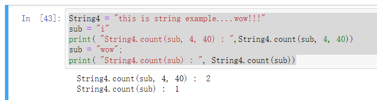 ?count() 方法用于统计字符串里某个字符或子字符串出现的次数。可选参数为在字符串搜索的开始与结束位置。? str.count(sub, start= 0,end=len(string))