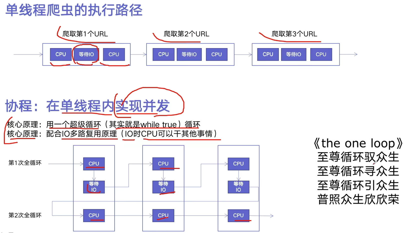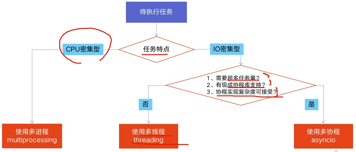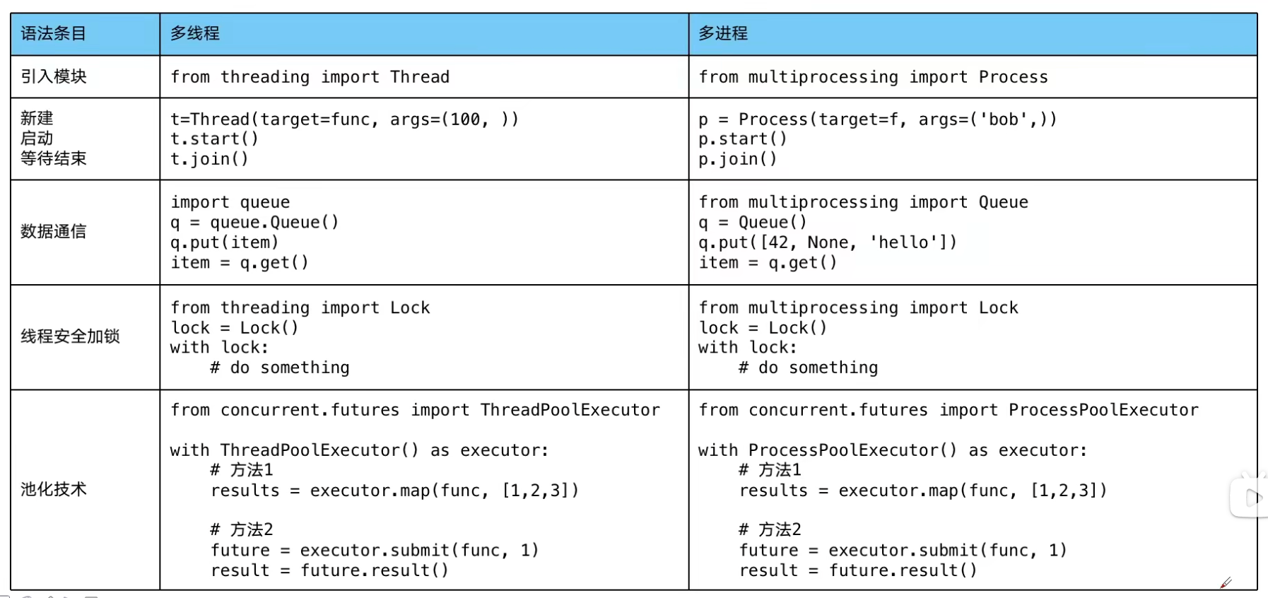 1.多线程:threading,利用CPU和IO可以同时执行的原理,让CPU不会干巴巴等待IO完成 2.多进程:multiprocessing,利用多核CPU的能力,真正的并行执行任务 3.异步IO:asyncio,在单线程利用CPU和IO同时执行的原理,实现函数异步执行